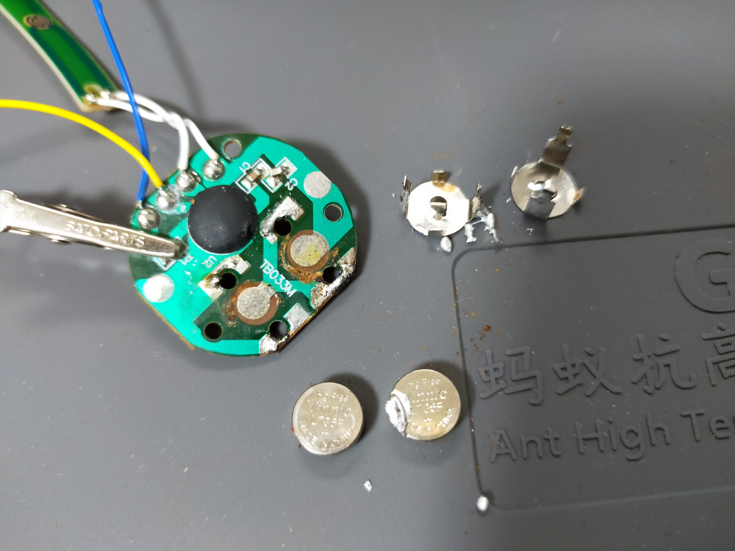 テスターで、電源電圧を確認。特に違和感はなく、安定した電圧。ボタン電池2個で3Vくらいなので電池は減りぎみなものの問題なし。