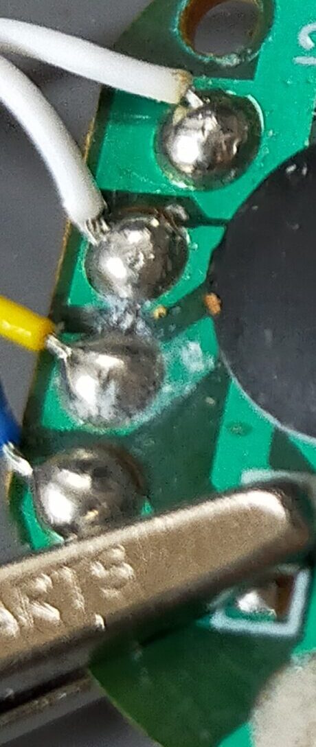 怪しそうなところありました。黄色のブザーにいってる線と、スイッチの上流側の線のランドの間、なんか汚いです。肉眼で見ると、すこし透明っぽくで、フラックスか、基板のコーティングかなみたいな見た目。