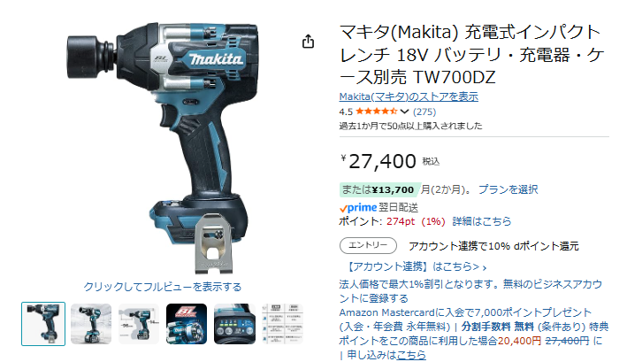 機能的にはこっちのがパワーの切り替え4段階あったり、検証動画とかを見るとトルク掛けながらのビス打ちの速さは、マキタが段違いに良いとのこと。仕事でガンガンつかっていくってなるとやっぱりマキタなのでしょうね・・・でも、本体だけでの値段で、これです。気軽には買えないです